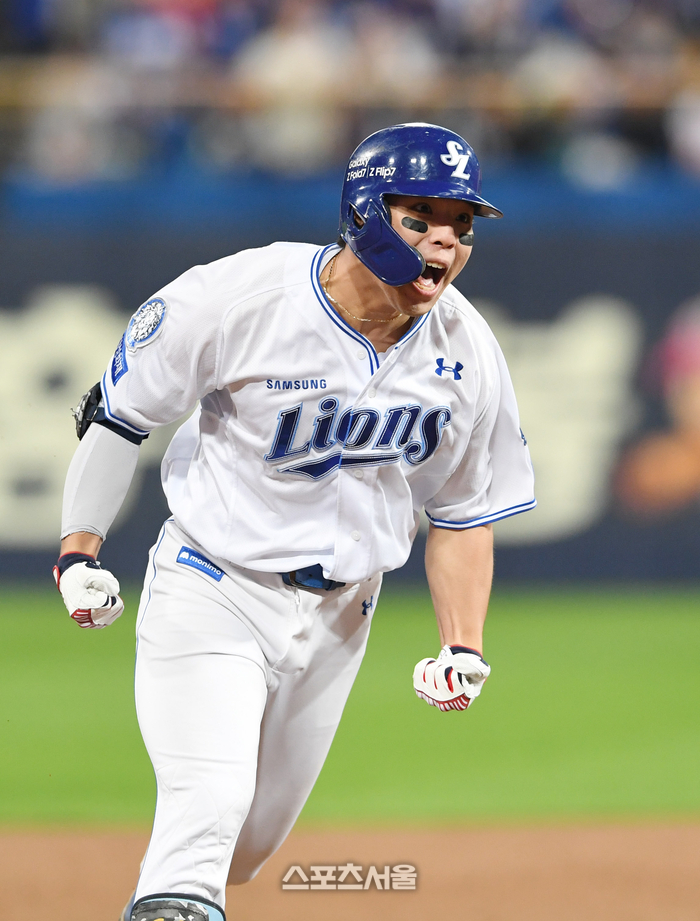삼성 김영웅이 21일 대구 삼성라이온즈파크에서 열린 2025 KBO리그 한화와의 플레이오프 3차전 4회말 1사 1-2루 상황에서 한화 선발 류현진을 상대로 역전 3점 홈런을 친 뒤 포효하고 있다. 2025. 10. 21.
