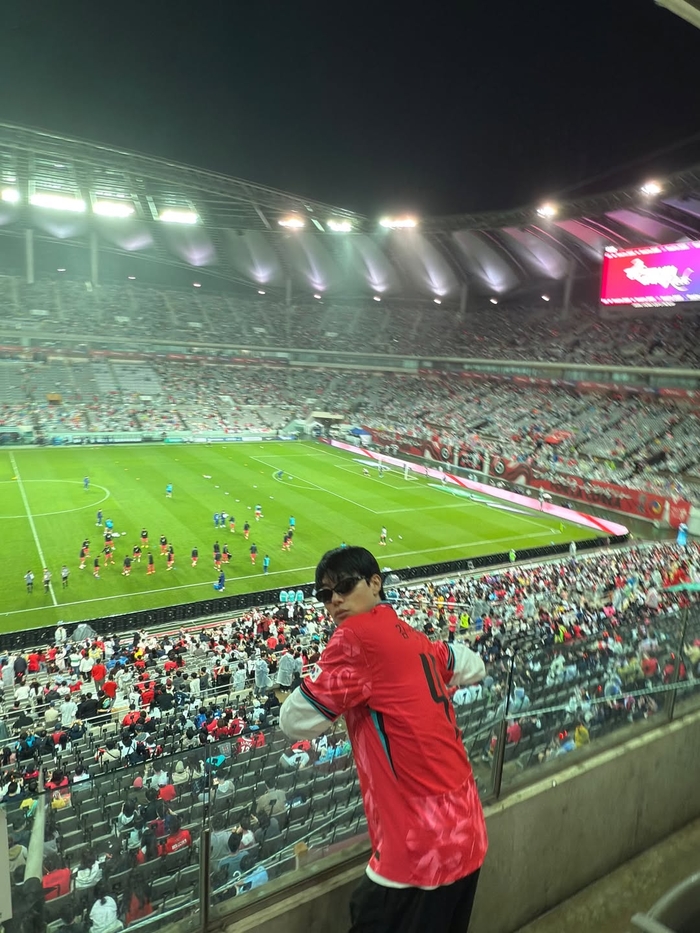 공개된 사진 속 류준열은 후드티를 쓴 편안한 차림으로 셀카를 찍거나, 거울 앞에서 캐주얼한 포즈를 취하고 있다. 또 다른 사진에서는 축구 경기장에서 붉은색 대표팀 유니폼을 입고 경기를 관람하는 모습이 담겨 있어, 일상 속 여유와 스포츠를 즐기는 건강한 에너지를 동시에 느끼게 한다.
