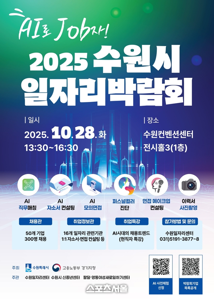 〔스포츠서울│수원=좌승훈기자〕경기 수원시는 고용노동부 경기지청과 오는 28일 오후 1시 30분부터 4시 30분까지 수원컨벤션센터 전시홀에서 ‘AI로 JOB자 일자리박람회’를 진행한다고 22일 밝혔다.
