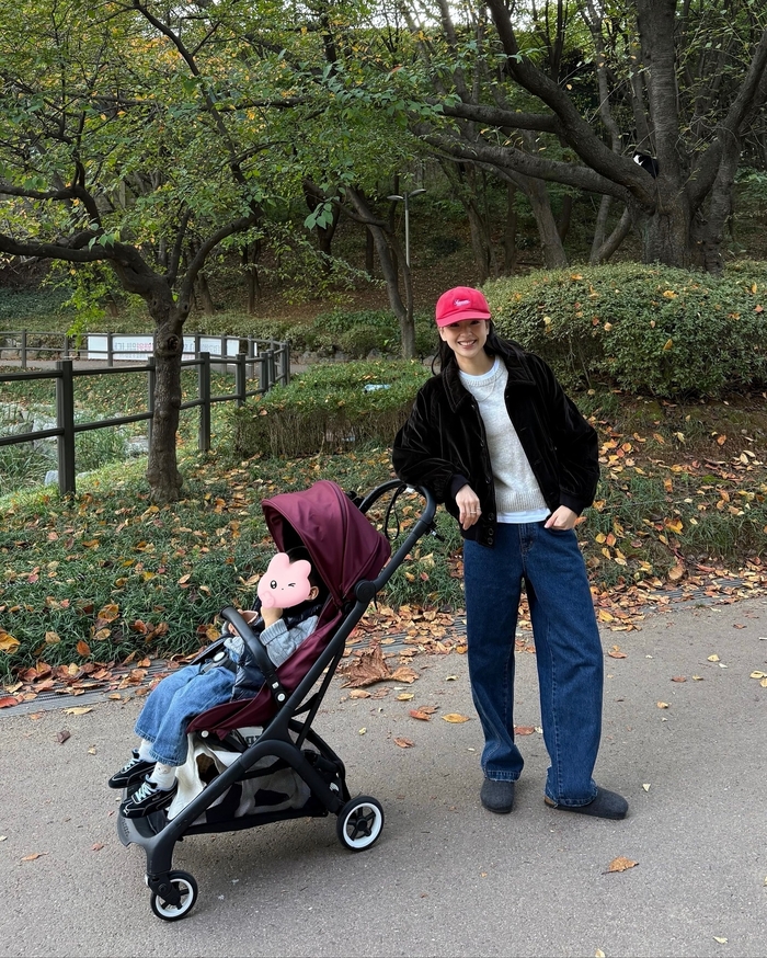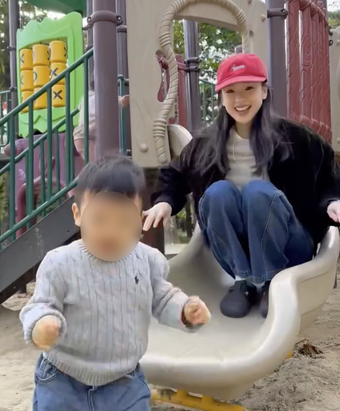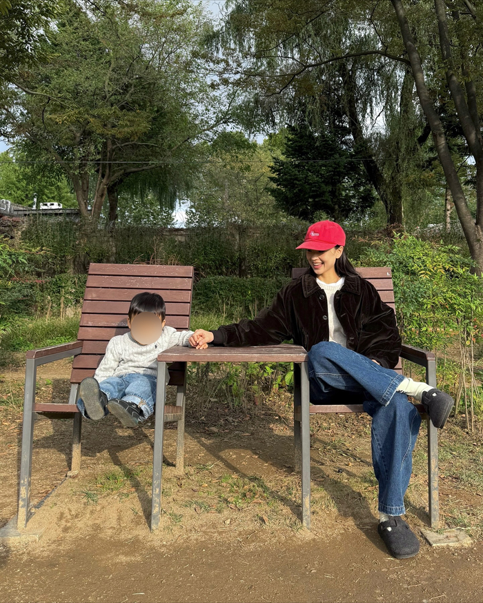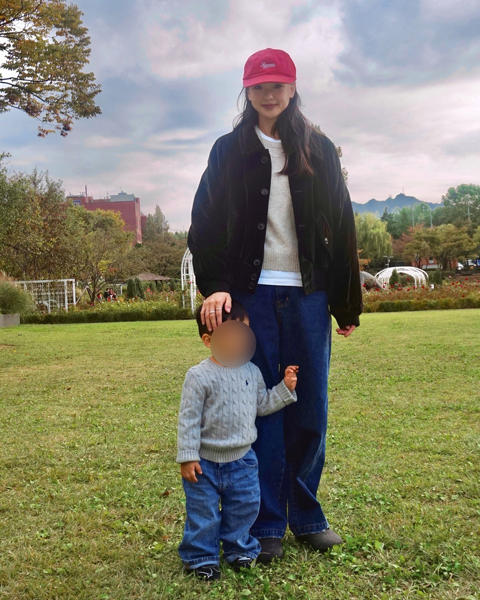 공개된 사진 속 손연재는 붉은색 볼캡에 캐주얼한 점퍼와 청바지 차림으로 아들과 함께 도심 속 공원을 산책하는 모습이다.