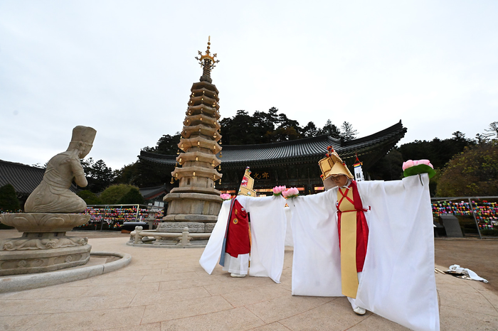 단풍이 절정을 이룬 천년고찰에서 청사초롱 행렬이 참가단들을 맞이하고 승무 공연과 탑돌이를 선보이며 세계 각국에서 온 손님들에게 한국의 전통과 환영의 인사를 건넨다.