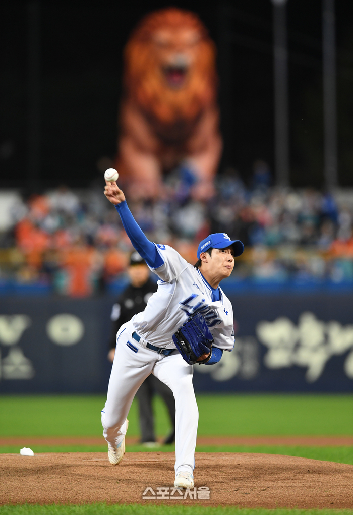 삼성 원태인이 22일 대구 삼성라이온즈파크에서 열린 2025 KBO리그 한화와의 플레이오프 4차전에 선발 등판해 힘차게 공을 던지고 있다. 2025. 10. 22.