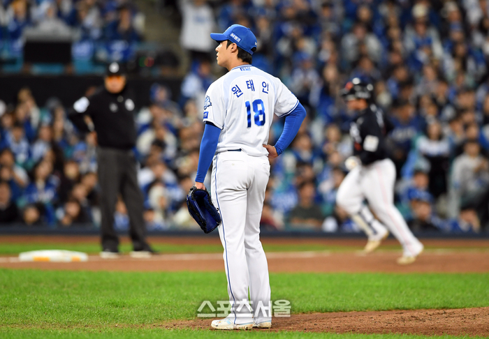 삼성 선발투수 원태인이 22일 대구 삼성라이온즈파크에서 열린 2025 KBO리그 한화와의 플레이오프 4차전 5회초 2사 2-3루 상황에서 한화 문현빈에게 3점 홈런을 허용한 뒤 아쉬워하고 있다. 2025. 10. 22.