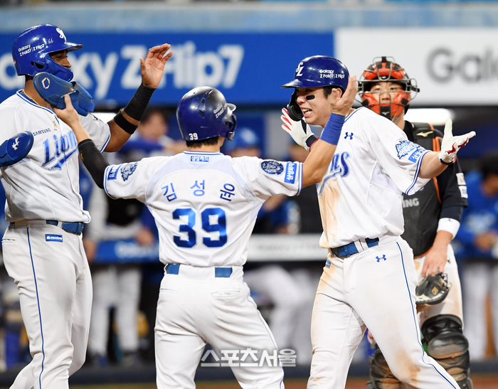 삼성 김영웅(오른쪽)이 22일 대구 삼성라이온즈파크에서 열린 2025 KBO리그 한화와의 플레이오프 4차전 6회말 1사 1-3루 상황에서 한화 김서현을 상대로 동점 3점 홈런을 친 뒤 선행주자 디아즈-김성윤과 하이파이브를 하고 있다. 2025. 10. 22.