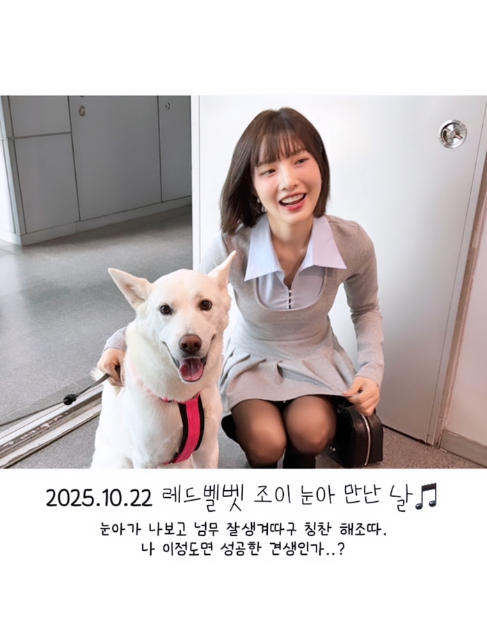 사진 속 조이는 단발 헤어스타일에 단정한 그레이 톤 의상을 입고 풍이와 눈높이를 맞추며 다정한 눈빛을 주고받는 모습이다. 특히 풍이에게 꿀 떨어지는 눈빛으로 말을 건네는 모습은 보는 이들에게 미소를 선물했다.