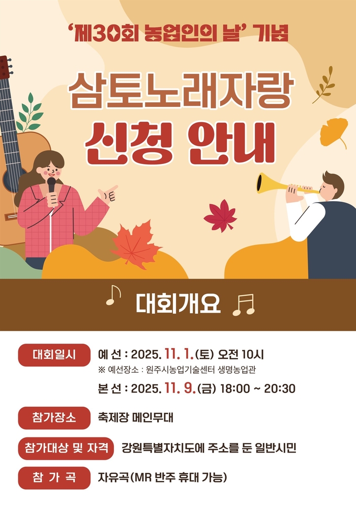 [스포츠서울ㅣ원주=김기원기자]한국농촌지도자 원주시연합회(회장 김인식)가 주최·주관하는 ‘2025 원주 삼토페스티벌’이 11월 8일부터 11일까지 4일간, 댄싱공연장 일원에서 개최된다.