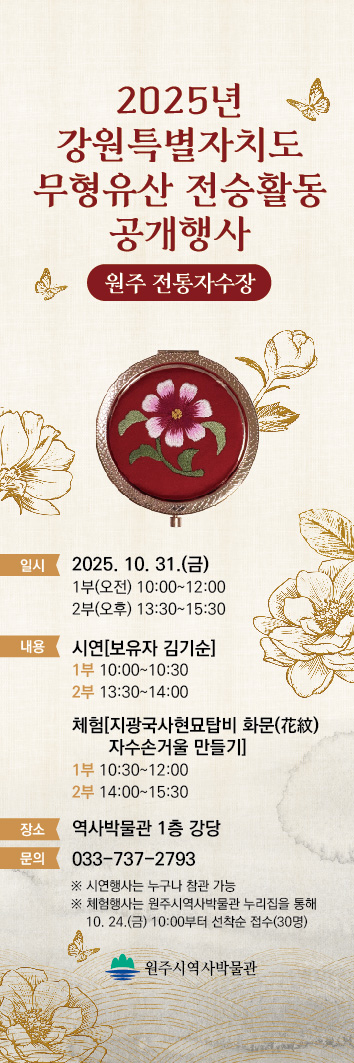 원주전통자수장(보유자 김기순)은 전통자수 기법 시연과 함께 법천사 지광국사현묘탑비 화문(花紋) 문양 자수손거울 만들기 체험이 마련된다. 10월 31일 1부 행사는 오전 10시부터, 2부 행사는 오후 1시 30분부터 각 2시간 동안 운영되며, 누구나 참여할 수 있다. 체험 프로그램은 10월 24일 오전 10시부터 박물관 홈페이지에서 선착순 30명을 모집한다.