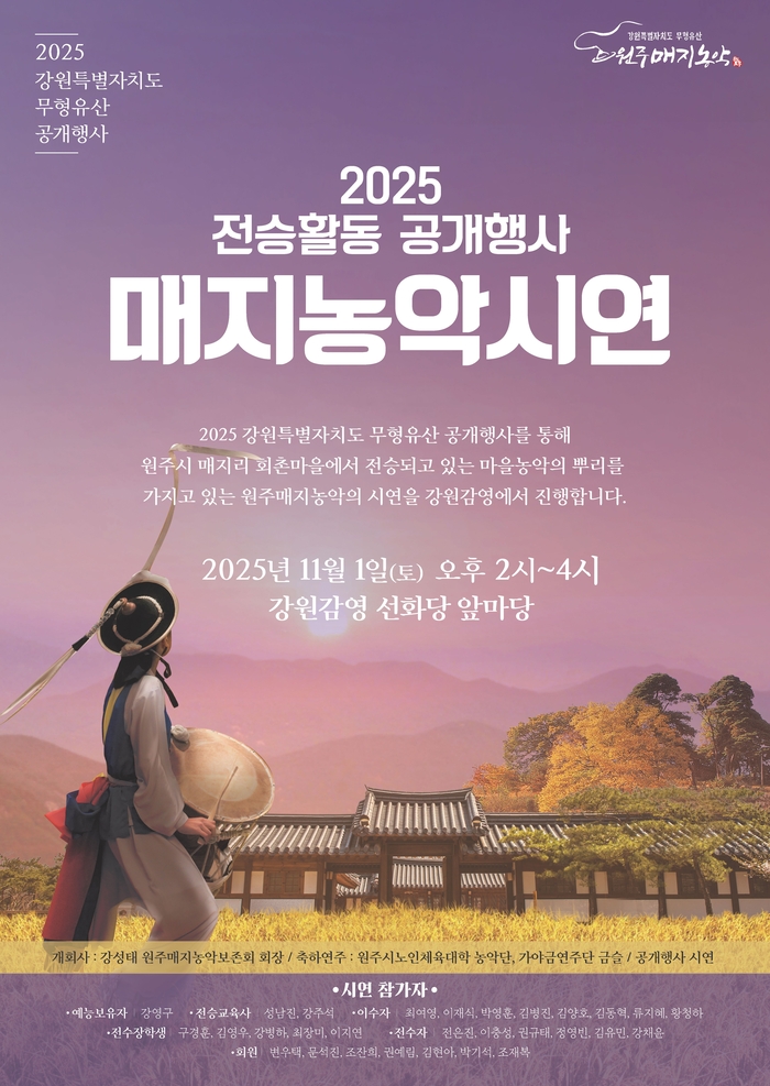 원주매지농악은 보유단체인 (사)원주매지농악보존회 주관으로 11월 1일 오후 2시부터 강원감영에서 개최된다. 특히 강원감영 국화전시회 기간과 맞물려 가을꽃으로 아름답게 물든 감영에서 매지농악과 함께 가을의 정취를 만끽할 수 있다.