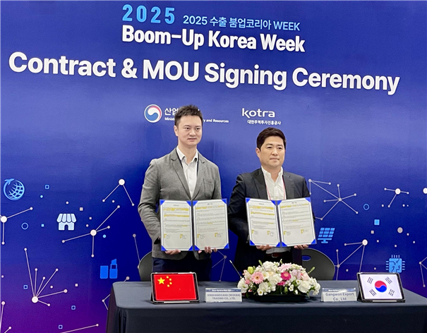 [스포츠서울ㅣ춘천=김기원기자]㈜강원수출(대표 함승우)은‘2025 수출 붐업코리아 위크(WEEK)’(10.21., 고양시 킨텍스) 현장에서 중국 후베이성 최대 수입식품 전문기업 신상강(XINSHANGGANG(WUHAN) TRADING CO., LTD)과 총 1,000만 달러 규모 장기 수출협약(MOU)을 체결했다.