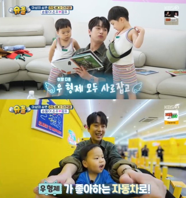 이찬원은 지난 22일 방송된 KBS2 ‘슈퍼맨이 돌아왔다’(이하 ‘슈돌’)에 출연해 펜싱 금메달리스트 김준호 아들 은우, 정우를 만났다.