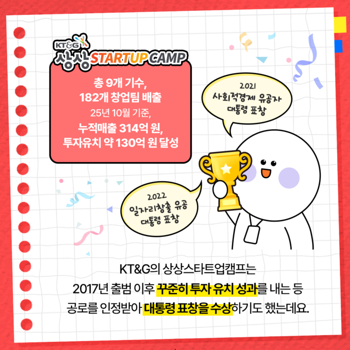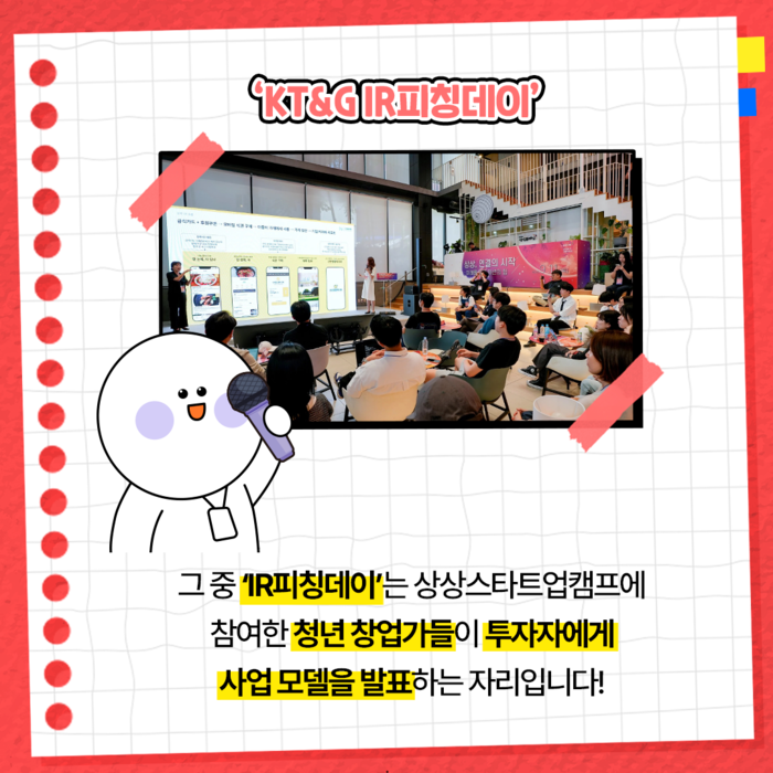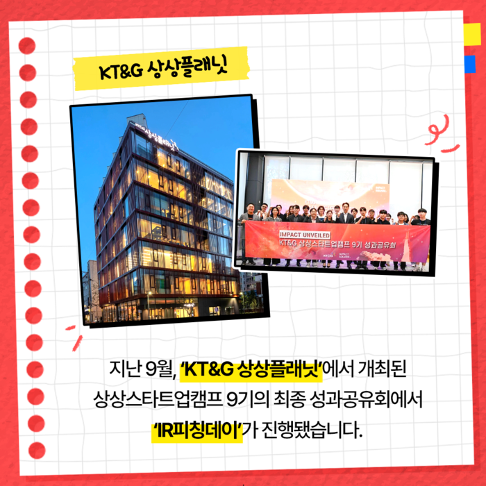 경제 | 기업 [카드뉴스] KT&G, 상상스타트업캠프 9기 ‘IR피칭데이’ 개최 입력2025-10-23 10:06:20 북마크 페이스북 트위터 SNS 더보기 가글자크기설정 인쇄 SNS 더보기 닫기 네이버밴드 네이버블로그 URL복사 글자크기 설정 메뉴 닫기 글자크기 설정 시 다른 기사의 본문도동일하게 적용됩니다. 가 가 가 가 가 [스포츠서울 | 신재유 기자]whyjay@sportsseoul.com 기사추천 0