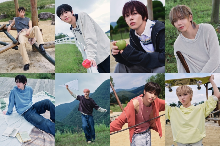 개인 콘셉트 포토에서는 한층 퓨어한 매력을 자랑한다. 아홉(AHOF)은 들판과 놀이터 등 각기 다른 장소에서 한가로이 시간을 보내는 모습이다.