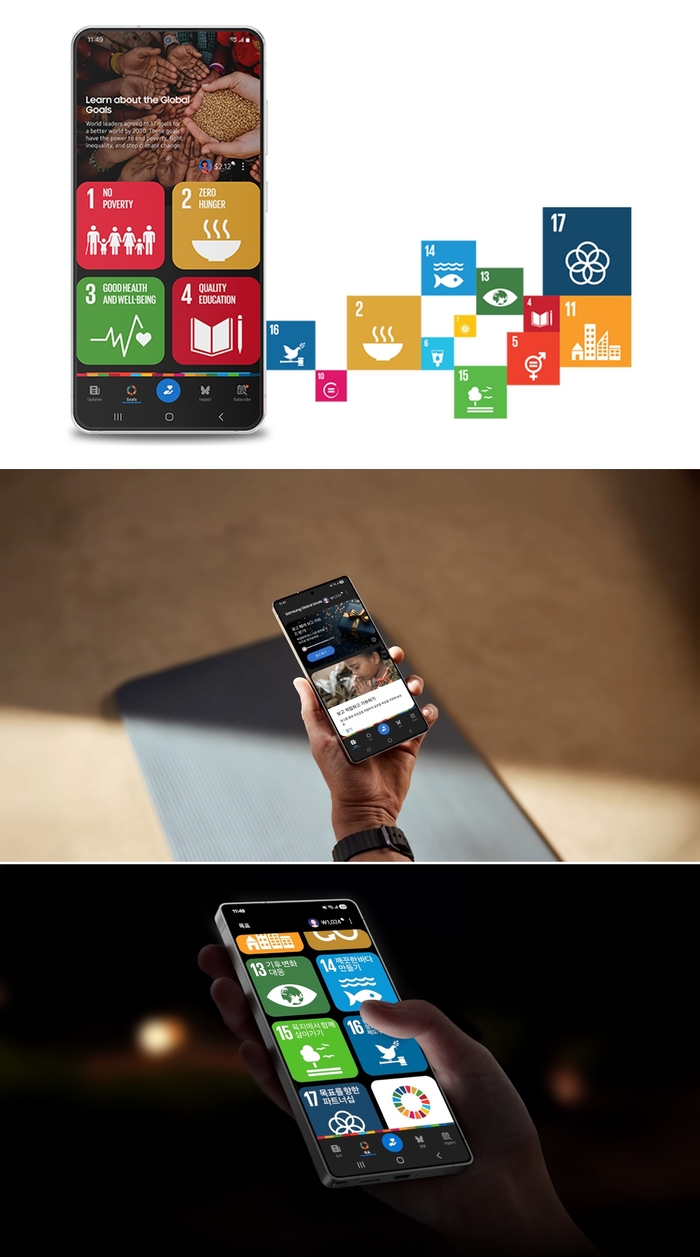 2019년 출시한 ‘삼성 글로벌골즈 앱’은 삼성전자와 유엔개발계획(UNDP)가 파트너십을 맺고 사용자들이 ▲양질의 교육 ▲기후 변화 대응 ▲깨끗한 바다 만들기 등 17개의 지속가능개발목표(Sustainable Development Goals) 달성을 위해 참여할 수 있도록 개발한 플랫폼이다.