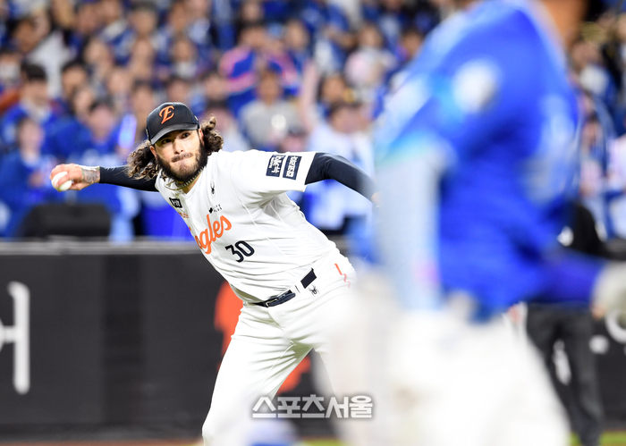 한화 폰세가 대전 한화생명볼파크에서 열린 2025 KBO리그 삼성과의 플레이오프 5차전 3회초 1사 1루 상황에서 삼성 디아즈의 잡아 1루로 송구하고 있다. 2025 10. 24.