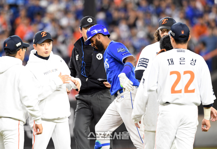삼성 디아즈(가운데)가 대전 한화생명볼파크에서 열린 2025 KBO리그 한화와의 플레이오프 5차전 3회초 1사 1루 상황에서 자신의 타구에 몸을 맞은 한화 선발투수 폰세에게 사과의 포옹을 한 뒤 더그아웃으로 들어가고 있다. 2025 10. 24.