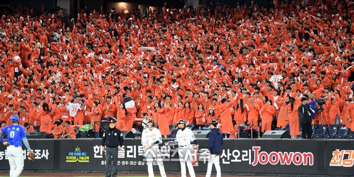한화 팬들이 24일 대전 한화생명볼파크에서 열린 2025 KBO 포스트시즌 플레이오프 5차전 삼성과 경기 5회말 무사2,3루 채은성이 2타점 우중간안타를 치자 환호하고 있다.