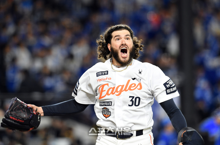 한화 선발투수 폰세가 대전 한화생명볼파크에서 열린 2025 KBO리그 삼성과의 플레이오프 5차전 5회초 2사 삼성 디아즈를 삼진 아웃으로 잡아낸 뒤 포효하고 있다. 2025 10. 24.