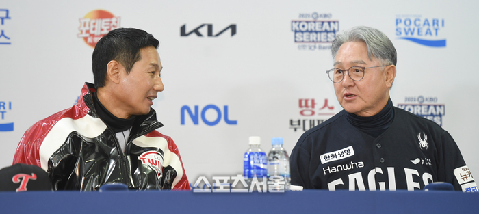 LG 염경엽 감독과 한화 김경문 감독이 25일 서울 잠실구장에서 열린 2025 KBO 포스트시즌 한국시리즈 미디어데이 전 이야기를 나누고 있다.