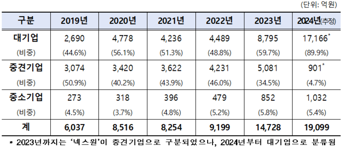 대기업의 신규 연구개발 투자는 △2019년 2690억 원 △2020년 4778억 원 △2021년 4236억 원 △2022년 4489억 원, △2023년 8795억 원, △2024년 1만 7166억 원(추정)으로 6.4배 급등했다.