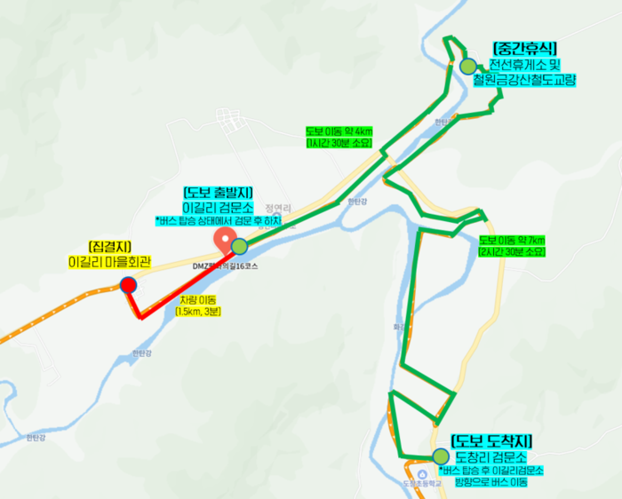 디엠지(DMZ) 평화의 길 16코스는 철원 두루미평화타운에서 남대천교까지 약 21.2km 구간으로, 대부분이 민간인통제구역(CCA) 내에 위치한다. 이번 행사에서는 이길리 검문소부터 삼합교 인근까지 약 7km 구간을 함께 걷는다.