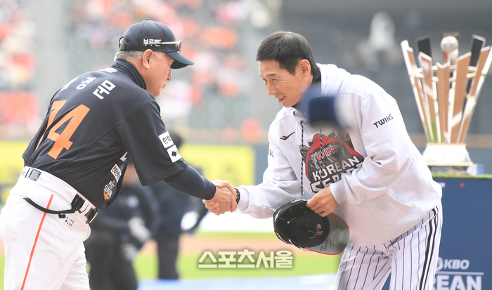 LG 염경엽 감독이 26일 서울 잠실구장에서 열린 2025 KBO 포스트시즌 한국시리즈 1차전 한화와 경기 식전 행사에서 김경문 감독과 악수를 하고 있다.