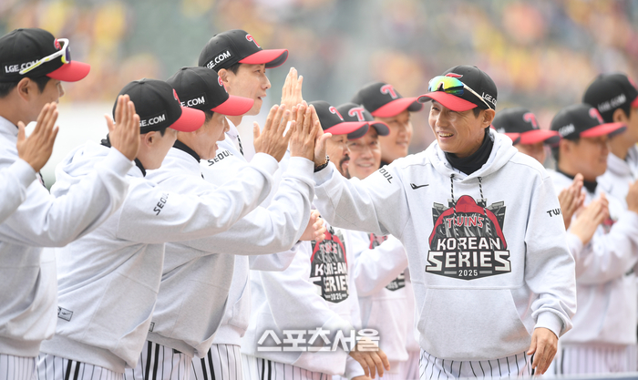LG 염경엽 감독이 26일 서울 잠실구장에서 열린 2025 KBO 포스트시즌 한국시리즈 1차전 한화와 경기 식전 행사에서 선수단과 하이파이브를 하고 있다.