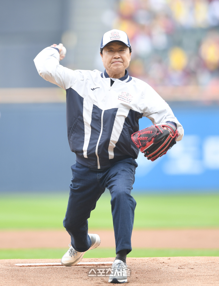 김재박 전 감독이 26일 서울 잠실구장에서 열린 2025 KBO 포스트시즌 한국시리즈 1차전 한화와 LG의 경기 시구를 하고 있다.