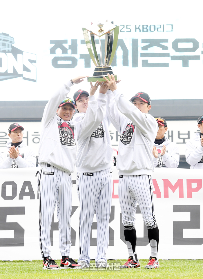 LG 염경엽 감독(왼쪽)과 임찬규(가운데), 박해민이 26일 잠실구장에서 열리는 2025 KBO리그 한화와의 한국시리즈 1차전에 앞서 페넌트레이스 우승 트로피를 들어올리며 기념촬영을 하고 있다. 2025. 10. 26.