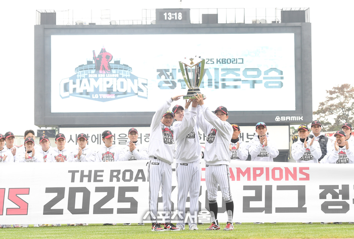 LG 염경엽 감독(왼쪽)과 임찬규(가운데), 박해민이 26일 잠실구장에서 열리는 2025 KBO리그 한화와의 한국시리즈 1차전에 앞서 페넌트레이스 우승 트로피를 들어올리며 기념촬영을 하고 있다. 2025. 10. 26.