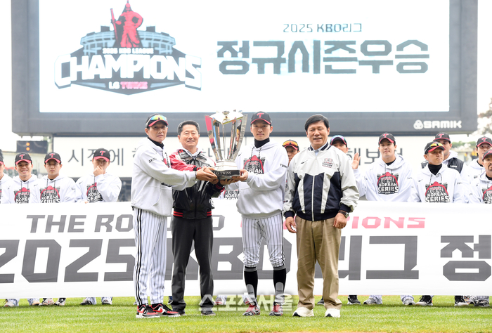 LG 염경엽 감독(왼쪽)과 김인석 사장(가운데), 주장 박해민이 26일 잠실구장에서 열리는 2025 KBO리그 한화와의 한국시리즈 1차전에 앞서 KBO 허구연 총재로부터 정규 시즌 우승 트로피를 건네받은 뒤 기념촬영을 하고 있다. 2025. 10. 26.