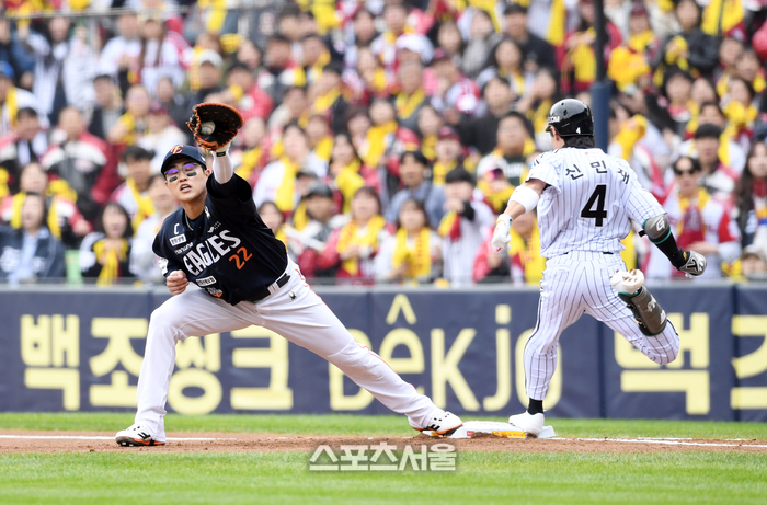 LG 신민재(오른쪽)가 26일 잠실구장에서 열린 2025 KBO리그 한화와의 한국시리즈 1차전 1회말 무사 1루 상황에서 내야안타를 치고 한화 1루수 채은성의 포구에 앞서 베이스를 밟고 있다. 2025. 10. 26.