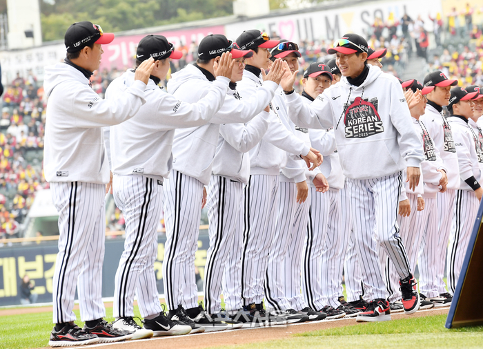 LG 염경엽 감독(맨 오른쪽)이 26일 잠실구장에서 열리는 2025 KBO리그 한화와의 한국시리즈 1차전에 앞서 선수들과 하이파이브를 하며 그라운드에 입장하고 있다. 2025. 10. 26.