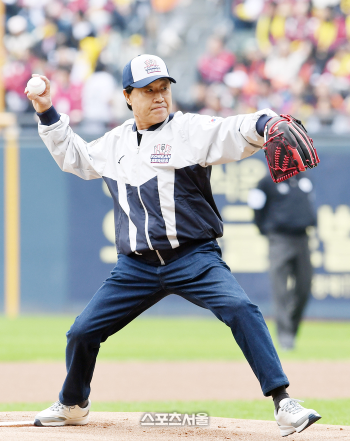 김재박 전 LG 트윈스 감독이 26일 잠실구장에서 열리는 2025 KBO리그 한화와 LG의 한국시리즈 1차전에 앞서 시구를 하고 있다. 2025. 10. 26.