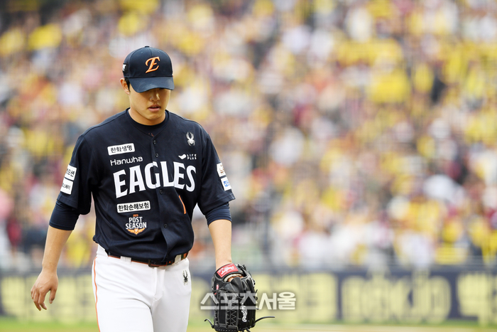 한화 선발투수 문동주가 26일 잠실구장에서 열린 2025 KBO리그 LG와의 한국시리즈 1차전 5회말 1사 1루 상황에서 마운드에서 내려가고 있다. 2025. 10. 26.