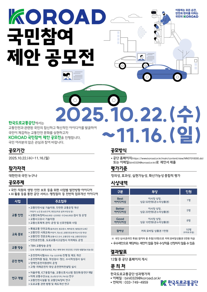 이번 공모전은 10월 22일부터 11월 16일까지 진행되며, 대한민국 국민이면 누구나 참여할 수 있다. 공단 주요 사업인 ▲교통안전 ▲교통안전 교육‧홍보 ▲교통방송 ▲운전면허 ▲연구개발 및 경영혁신 등과 관련한 아이디어를 공단 누리집(www.koroad.or.kr) 또는 이메일(bini0329@koroad.or.kr)로 제출하면 된다.