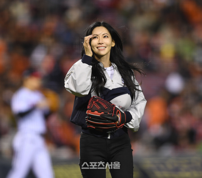 배우 김소연이 27일 서울 잠실구장에서 열린 2025 KBO 포스트시즌 한국시리즈 2차전 한화와 LG의 경기 시구 후 관중에 인사를 하고 있다.