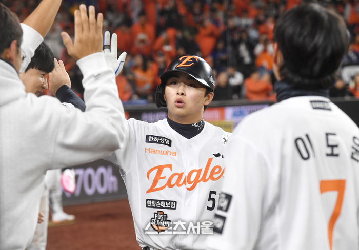 [스포츠서울 | 잠실=이소영 기자] 첫 가을야구 맞나 싶다. 심지어 한국시리즈(KS)는 다른 시리즈와 또 다르다. 여기서 한화 문현빈(21)과 노시환(25)이 나란히 홈런을 작렬했다. '미쳤다'는 말이 절로 나온다.