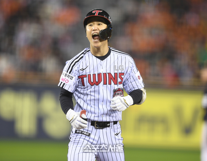 LG 구보혁이 27일 서울 잠실구장에서 열린 2025 KBO 포스트시즌 한국시리즈 2차전 한화와 경기 2회말 무사2,3루 2타점 우중간 안타를 친 후 환호하고 있다.