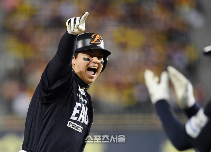 한화 노시환이 27일 잠실구장에서 열린 2025 KBO리그 LG와의 한국시리즈 2차전 1회초 1사 문현빈에 이어 LG 선발 임찬규를 상대로 백투백 홈런을 친 뒤 베이스를 돌며 포효하고 있다. 2025. 10. 27.