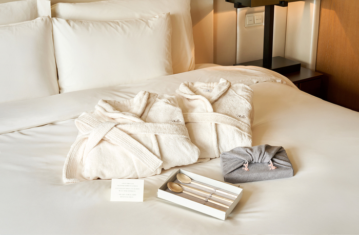 ‘배스 로브’에도 원하는 문구를 각인해 세상에 하나뿐인 선물로 제격이다. 패키지 예약 시 원하는 문구를 전달하면 배스 로브에 자수로 새겨서 증정하며, 배스 로브는 라지 1개, 미디움 1개로 구성된다.