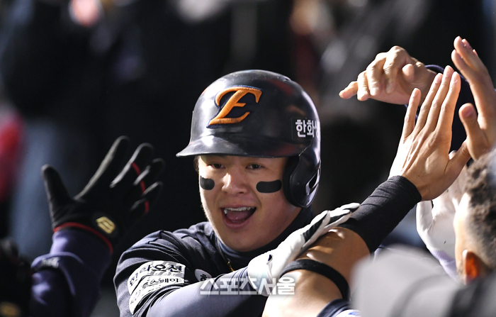 한화 노시환이 27일 잠실구장에서 열린 2025 KBO리그 LG와의 한국시리즈 2차전 1회초 1사 문현빈에 이어 LG 선발 임찬규를 상대로 백투백 홈런을 친 뒤 동료들과 하이파이브를 하고 있다. 2025. 10. 27.