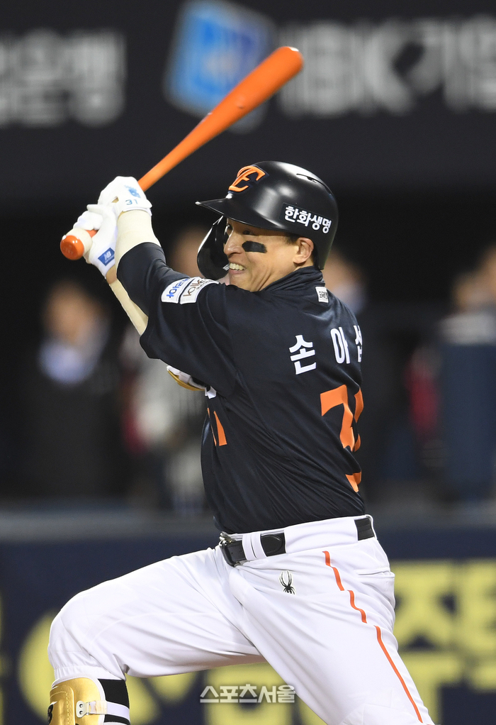 한화 손아섭이 27일 잠실구장에서 열린 2025 KBO리그 LG와의 한국시리즈 2차전 1회초 2사 LG 선발 임찬규를 상대로 2루타를 치고 있다. 2025. 10. 27.