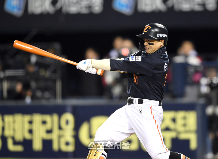 한화 손아섭이 27일 잠실구장에서 열린 2025 KBO리그 LG와의 한국시리즈 2차전 1회초 2사 LG 선발 임찬규를 상대로 2루타를 치고 있다. 2025. 10. 27.
