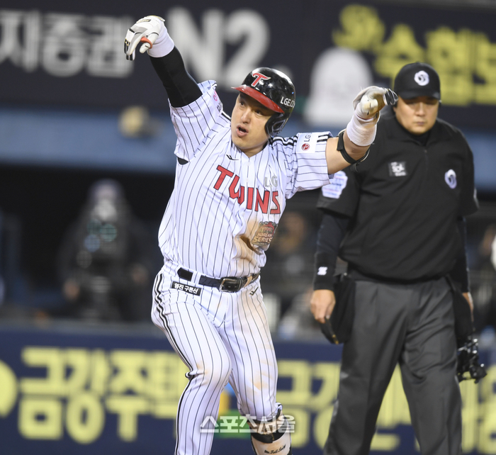 LG 박동원이 27일 서울 잠실구장에서 열린 2025 KBO 포스트시즌 한국시리즈 2차전 한화와 경기 3회말 2사1루 좌월홈런을 날린 후 홈으로 들어오고 있다.