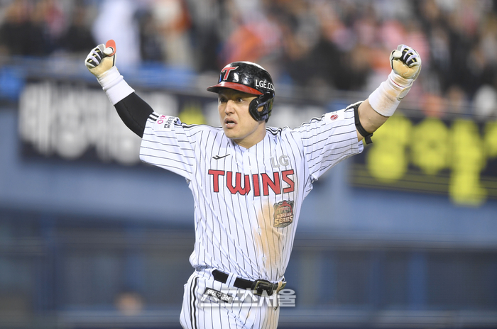 LG 박동원이 27일 서울 잠실구장에서 열린 2025 KBO 포스트시즌 한국시리즈 2차전 한화와 경기 3회말 2사1루 좌월홈런을 날린 후 환호하고 있다.