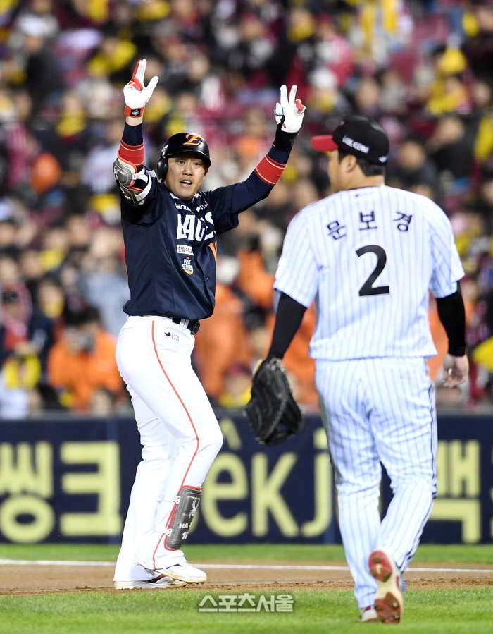 한화 하주석이 27일 잠실구장에서 열린 2025 KBO리그 LG와의 한국시리즈 2차전 1회초 2사 2루 상황에서 LG 선발 임찬규를 상대로 1타점 적시타를 치고 세리머니를 하고 있다. 2025. 10. 27.