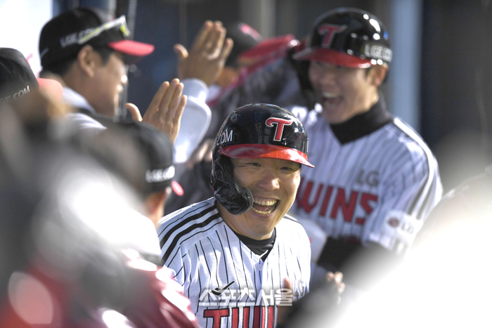 LG 김현수가 27일 서울 잠실구장에서 열린 2025 KBO 포스트시즌 한국시리즈 2차전 한화와 경기 4회말 2사만루 문보경 2루타 때 홈을 밟은 후 동료들과 환호하고 있다.