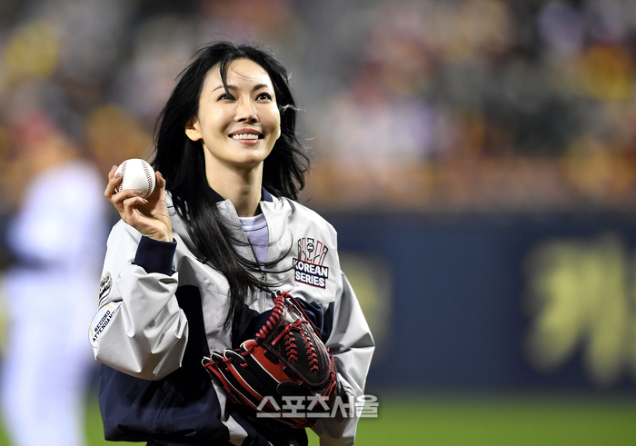 배우 김소연이 27일 잠실구장에서 열린 2025 KBO리그 한화와 LG의 한국시리즈 2차전에 앞서 시구를 한 뒤 관중석을 향해 인사를 하고 있다. 2025. 10. 27.