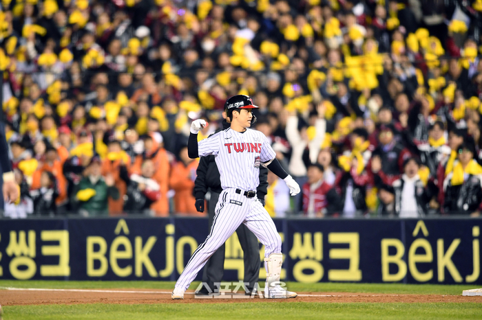 LG 구본혁이 27일 잠실구장에서 열린 2025 KBO리그 한화와의 한국시리즈 2차전 2회말 무사 2-3루 상황에서 한화 선발 류현진을 상대로2타점 적시타를 치고 기뻐하고 있다. 2025. 10. 27.