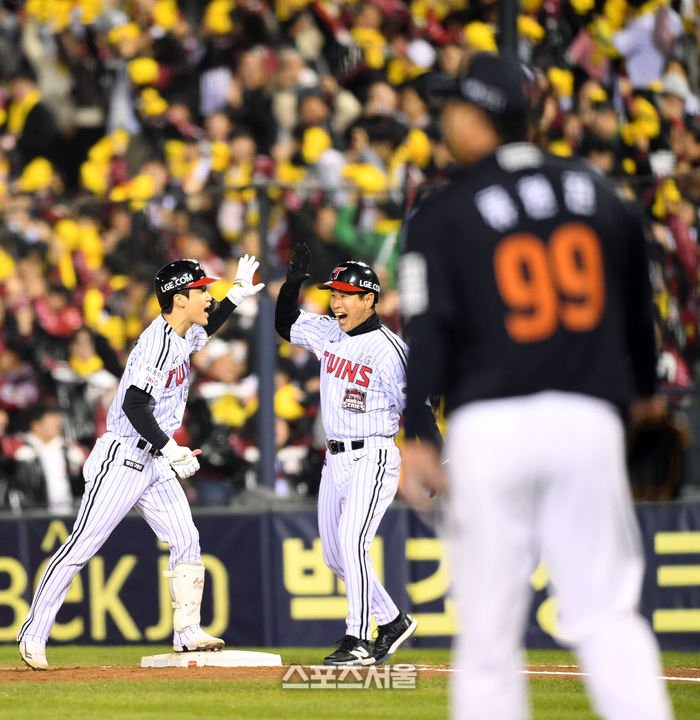 LG 구본혁(왼쪽)이 27일 잠실구장에서 열린 2025 KBO리그 한화와의 한국시리즈 2차전 2회말 무사 2-3루 상황에서 한화 선발 류현진을 상대로2타점 적시타를 치고 송지만 코치와 하이파이브를 하며 기뻐하고 있다. 2025. 10. 27.